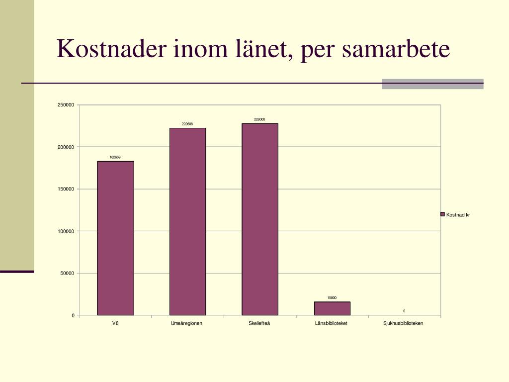 Snittkostnad per lån • Folkbibliotekens kostnader är för tur och retur • Länsbibliotekets kostnad är endast tur • Sjukhusbiblioteken har ingen direkt kostnad • Umeåregionen använder sig av Samhall • V8-biblioteken använder sig huvudsakligen av Bussgods, men även av Posten • V8-bibliotekens uppgifter inkluderar Sorseles lån men inte deras kostnader (11.7) • Skellefteå använder sig av anställd vaktmästare, sambulans och Posten. • Sjukhusbiblioteken använder sig av VLL-transport (OH, Posten) • Länsbiblioteket använder sig av Posten