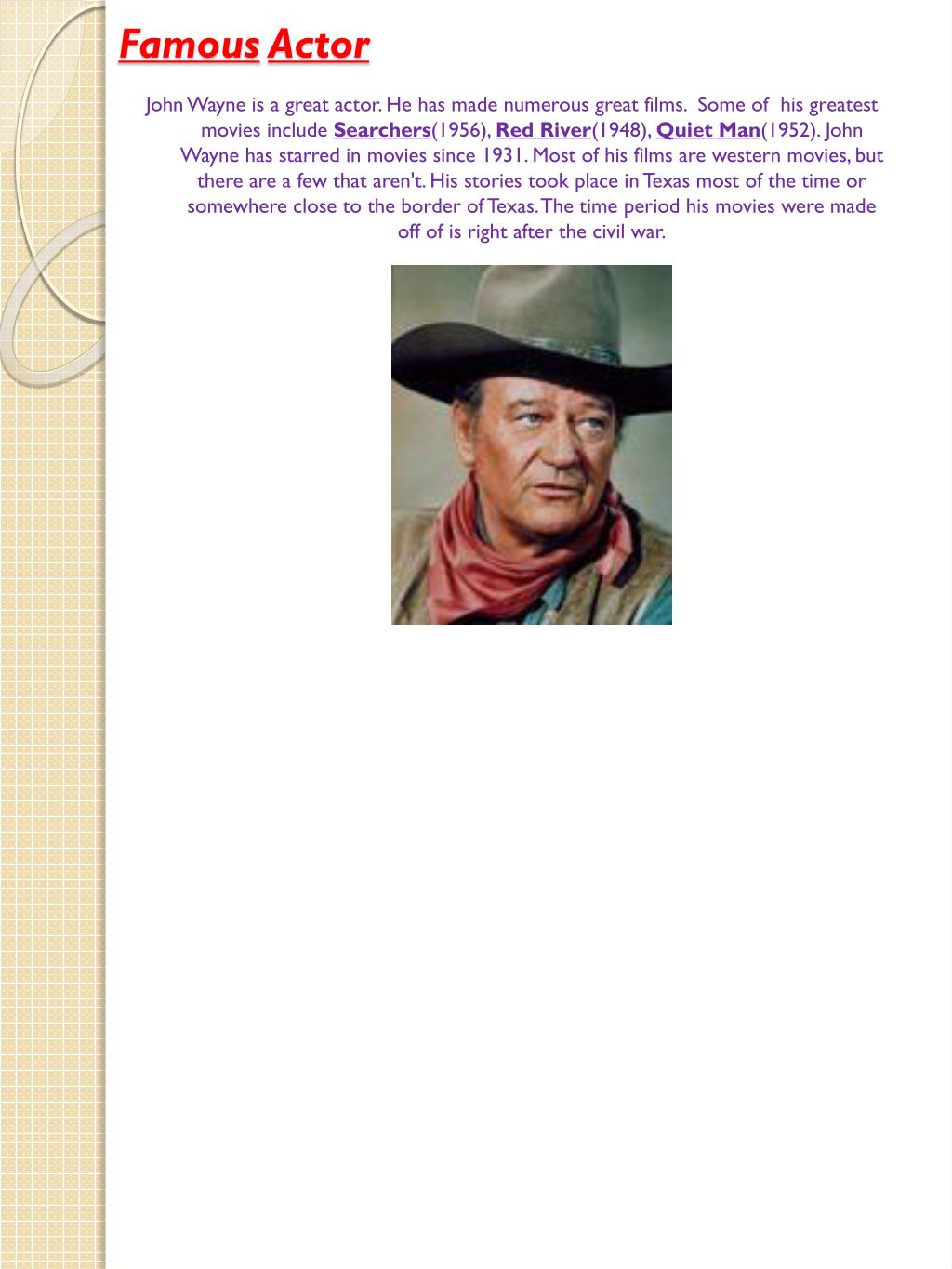 FamousActor John Wayne is a great actor. He has made numerous great films. Some of his greatest movies include Searchers(1956), Red River(1948), Quiet Man(1952). John Wayne has starred in movies since 1931. Most of his films are western movies, but there are a few that aren't. His stories took place in Texas most of the time or somewhere close to the border of Texas. The time period his movies were made off of is right after the civil war.
