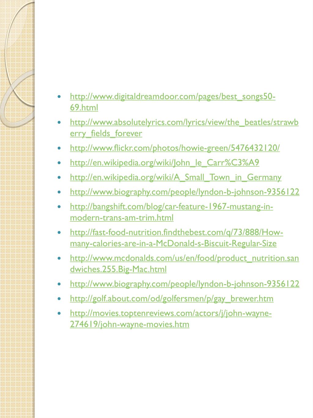 http://www.digitaldreamdoor.com/pages/best_songs50-69.html • http://www.absolutelyrics.com/lyrics/view/the_beatles/strawberry_fields_forever • http://www.flickr.com/photos/howie-green/5476432120/ • http://en.wikipedia.org/wiki/John_le_Carr%C3%A9 • http://en.wikipedia.org/wiki/A_Small_Town_in_Germany • http://www.biography.com/people/lyndon-b-johnson-9356122 • http://bangshift.com/blog/car-feature-1967-mustang-in-modern-trans-am-trim.html • http://fast-food-nutrition.findthebest.com/q/73/888/How-many-calories-are-in-a-McDonald-s-Biscuit-Regular-Size • http://www.mcdonalds.com/us/en/food/product_nutrition.sandwiches.255.Big-Mac.html • http://www.biography.com/people/lyndon-b-johnson-9356122 • http://golf.about.com/od/golfersmen/p/gay_brewer.htm • http://movies.toptenreviews.com/actors/j/john-wayne-274619/john-wayne-movies.htm