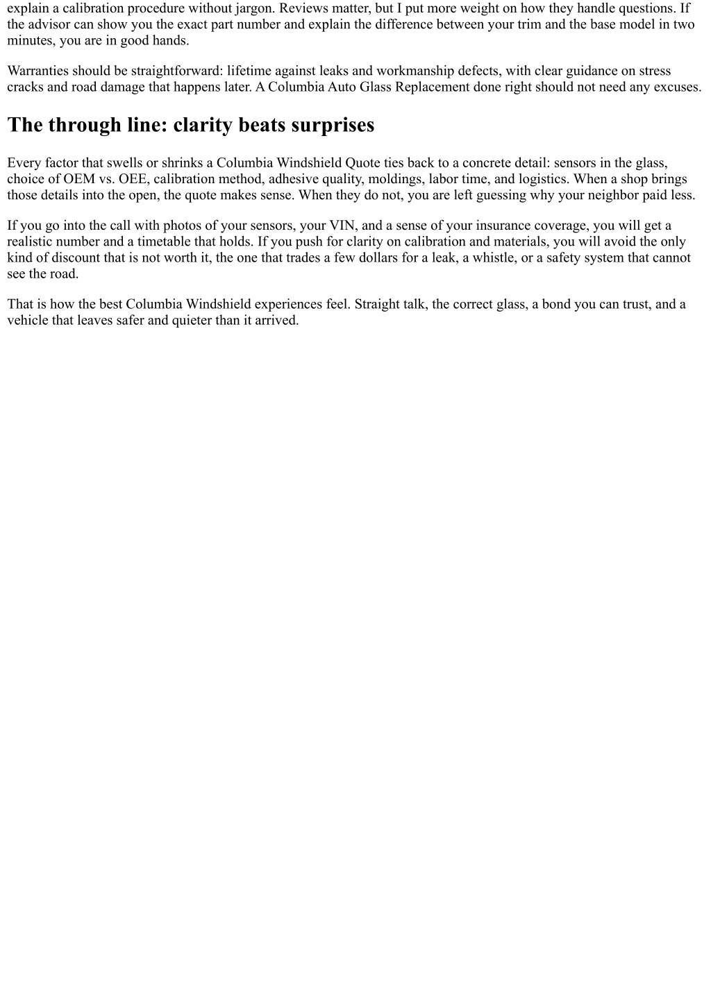 explain a calibration procedure without jargon. Reviews matter, but I put more weight on how they handle questions. If the advisor can show you the exact part number and explain the difference between your trim and the base model in two minutes, you are in good hands. Warranties should be straightforward: lifetime against leaks and workmanship defects, with clear guidance on stress cracks and road damage that happens later. A Columbia Auto Glass Replacement done right should not need any excuses. The through line: clarity beats surprises Every factor that swells or shrinks a Columbia Windshield Quote ties back to a concrete detail: sensors in the glass, choice of OEM vs. OEE, calibration method, adhesive quality, moldings, labor time, and logistics. When a shop brings those details into the open, the quote makes sense. When they do not, you are left guessing why your neighbor paid less. If you go into the call with photos of your sensors, your VIN, and a sense of your insurance coverage, you will get a realistic number and a timetable that holds. If you push for clarity on calibration and materials, you will avoid the only kind of discount that is not worth it, the one that trades a few dollars for a leak, a whistle, or a safety system that cannot see the road. That is how the best Columbia Windshield experiences feel. Straight talk, the correct glass, a bond you can trust, and a vehicle that leaves safer and quieter than it arrived.