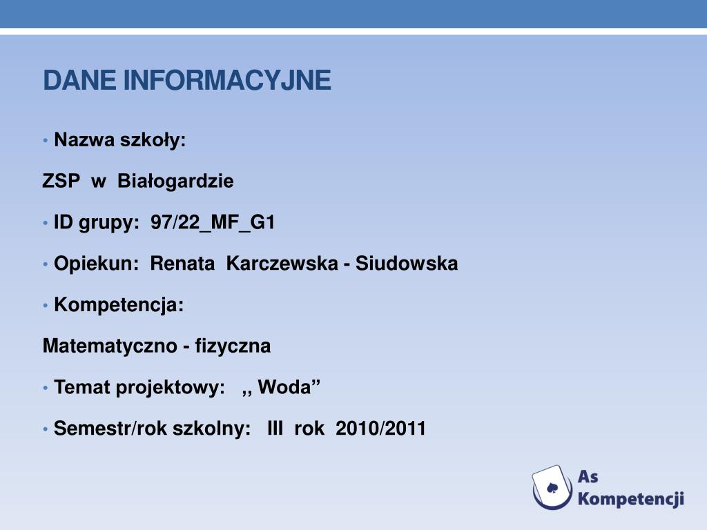 Dane INFORMACYJNE • Nazwa szkoły: • ZSP w Białogardzie • ID grupy: 97/22_MF_G1 • Opiekun: Renata Karczewska - Siudowska • Kompetencja: • Matematyczno - fizyczna • Temat projektowy: ,, Woda” • Semestr/rok szkolny: III rok 2010/2011