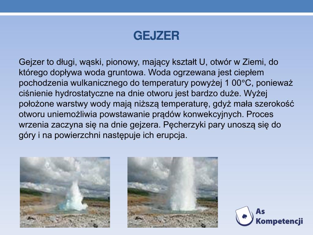 Gejzer • Gejzer to długi, wąski, pionowy, mający kształt U, otwór w Ziemi, do którego dopływa woda gruntowa. Woda ogrzewana jest ciepłem pochodzenia wulkanicznego do temperatury powyżej 1 00°C, ponieważ ciśnienie hydrostatyczne na dnie otworu jest bardzo duże. Wyżej położone warstwy wody mają niższą temperaturę, gdyż mała szerokość otworu uniemożliwia powstawanie prądów konwekcyjnych. Proces wrzenia zaczyna się na dnie gejzera. Pęcherzyki pary unoszą się do góry i na powierzchni następuje ich erupcja.