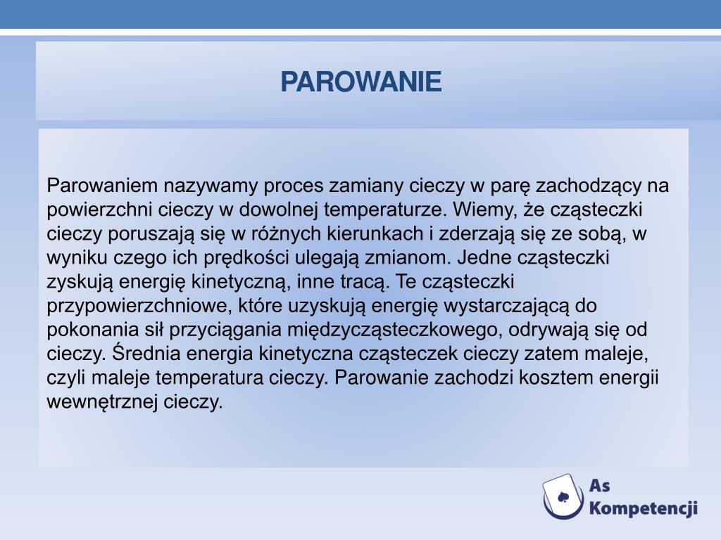 Parowanie Parowaniem nazywamy proces zamiany cieczy w parę zachodzący na powierzchni cieczy w dowolnej temperaturze. Wiemy, że cząsteczki cieczy poruszają się w różnych kierunkach i zderzają się ze sobą, w wyniku czego ich prędkości ulegają zmianom. Jedne cząsteczki zyskują energię kinetyczną, inne tracą. Te cząsteczki przypowierzchniowe, które uzyskują energię wystarczającą do pokonania sił przyciągania międzycząsteczkowego, odrywają się od cieczy. Średnia energia kinetyczna cząsteczek cieczy zatem maleje, czyli maleje temperatura cieczy. Parowanie zachodzi kosztem energii wewnętrznej cieczy.