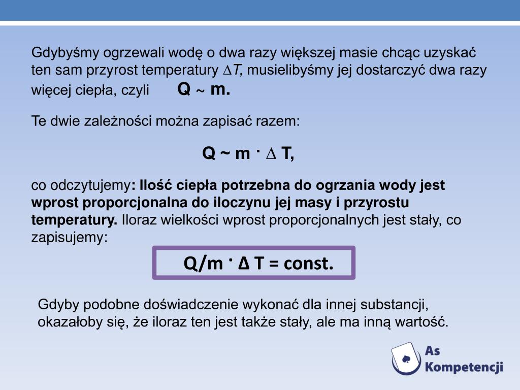Gdybyśmy ogrzewali wodę o dwa razy większej masie chcąc uzyskać ten sam przyrost temperatury∆T, musielibyśmy jej dostarczyć dwa razy więcej ciepła, czyliQ ~ m. • Te dwie zależności można zapisać razem: • Q ~ m · ∆ T, • co odczytujemy:Ilość ciepła potrzebna do ogrzania wody jest wprost proporcjonalna do iloczynu jej masy i przyrostu temperatury. Iloraz wielkości wprost proporcjonalnych jest stały, co zapisujemy: Q/m · ∆ T = const. Gdyby podobne doświadczenie wykonać dla innej substancji, okazałoby się, że iloraz ten jest także stały, ale ma inną wartość.