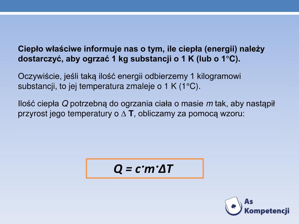 Ciepło właściwe informuje nas o tym, ile ciepła (energii) należy dostarczyć, aby ogrzać 1 kg substancji o 1 K (lub o 1°C). • Oczywiście, jeśli taką ilość energii odbierzemy 1 kilogramowi substancji, to jej temperatura zmaleje o 1 K (1°C). • Ilość ciepła Q potrzebną do ogrzania ciała o masie m tak, aby nastąpił przyrost jego temperatury o ∆T, obliczamy za pomocą wzoru: Q = c·m·∆T