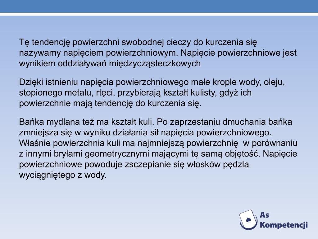 Tę tendencję powierzchni swobodnej cieczy do kurczenia się nazywamy napięciem powierzchniowym.Napięcie powierzchniowe jest wynikiem oddziaływań międzycząsteczkowych • Dzięki istnieniu napięcia powierzchniowego małe krople wody, oleju, stopionego metalu, rtęci, przybierają kształt kulisty, gdyż ich powierzchnie mają tendencję do kurczenia się. • Bańka mydlana też ma kształt kuli. Po zaprzestaniu dmuchania bańka zmniejsza się w wyniku działania sił napięcia powierzchniowego. Właśnie powierzchnia kuli ma najmniejszą powierzchnię w porównaniu z innymi bryłami geometrycznymi mającymi tę samą objętość. Napięcie powierzchniowe powoduje zsczepianie się włosków pędzla wyciągniętego z wody.