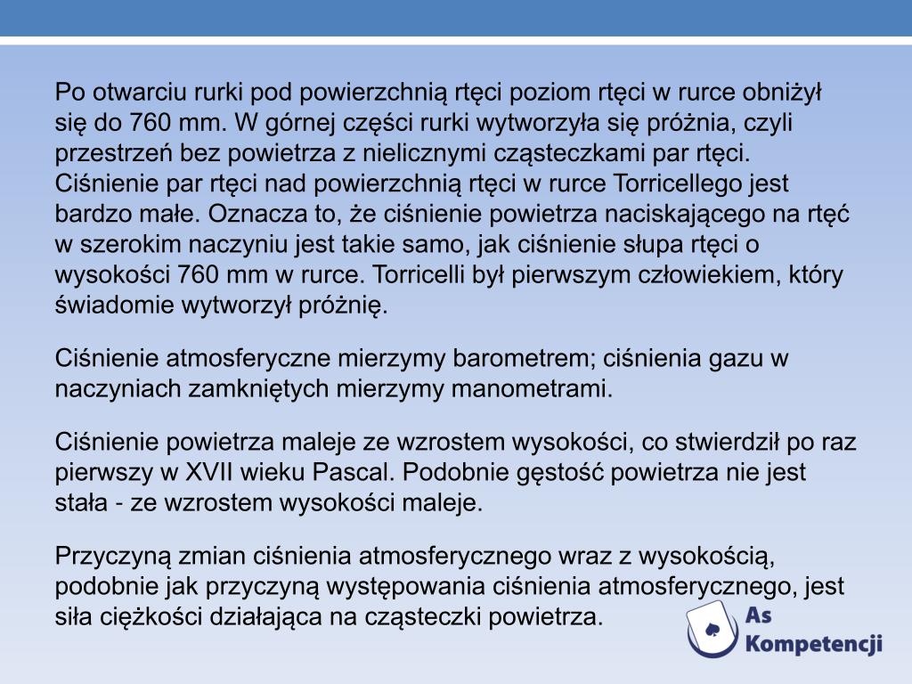Po otwarciu rurki pod powierzchnią rtęci poziom rtęci w rurce obniżył się do 760 mm. W górnej części rurki wytworzyła się próżnia, czyli przestrzeń bez powietrza z nielicznymi cząsteczkami par rtęci. Ciśnienie par rtęci nad powierzchnią rtęci w rurce Torricellego jest bardzo małe. Oznacza to, że ciśnienie powietrza naciskającego na rtęć w szerokim naczyniu jest takie samo, jak ciśnienie słupa rtęci o wysokości 760 mm w rurce. Torricelli był pierwszym człowiekiem, który świadomie wytworzył próżnię. • Ciśnienie atmosferyczne mierzymy barometrem; ciśnienia gazu w naczyniach zamkniętych mierzymy manometrami. • Ciśnienie powietrza maleje ze wzrostem wysokości, co stwierdził po raz pierwszy w XVII wieku Pascal. Podobnie gęstość powietrza nie jest stała - ze wzrostem wysokości maleje. • Przyczyną zmian ciśnienia atmosferycznego wraz z wysokością, podobnie jak przyczyną występowania ciśnienia atmosferycznego, jest siła ciężkości działająca na cząsteczki powietrza.