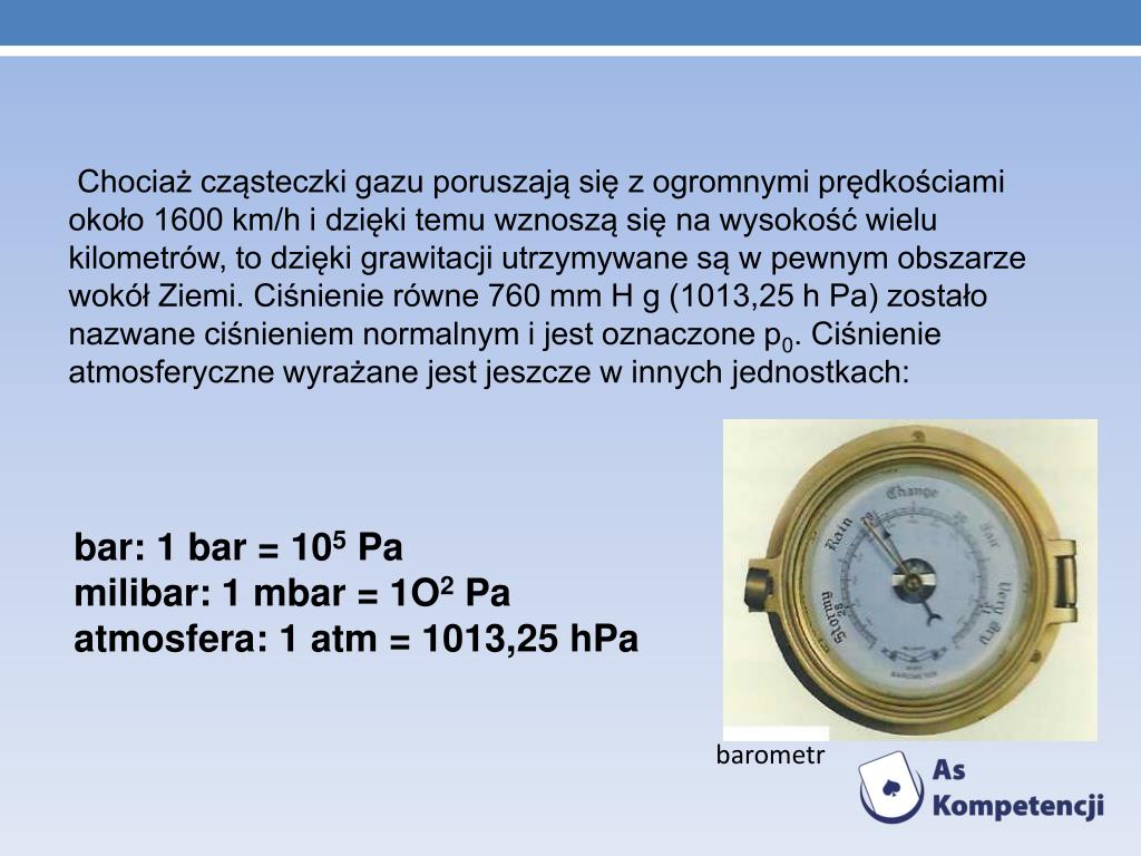 Chociaż cząsteczki gazu poruszają się z ogromnymi prędkościami około 1600 km/h i dzięki temu wznoszą się na wysokość wielu kilometrów, to dzięki grawitacji utrzymywane są w pewnym obszarze wokół Ziemi. Ciśnienie równe 760 mm H g (1013,25 h Pa) zostało nazwane ciśnieniem normalnym i jest oznaczone p0. Ciśnienie atmosferyczne wyrażane jest jeszcze w innych jednostkach: bar: 1 bar = 105 Pa milibar: 1 mbar = 1O2 Pa atmosfera: 1 atm = 1013,25 hPa barometr