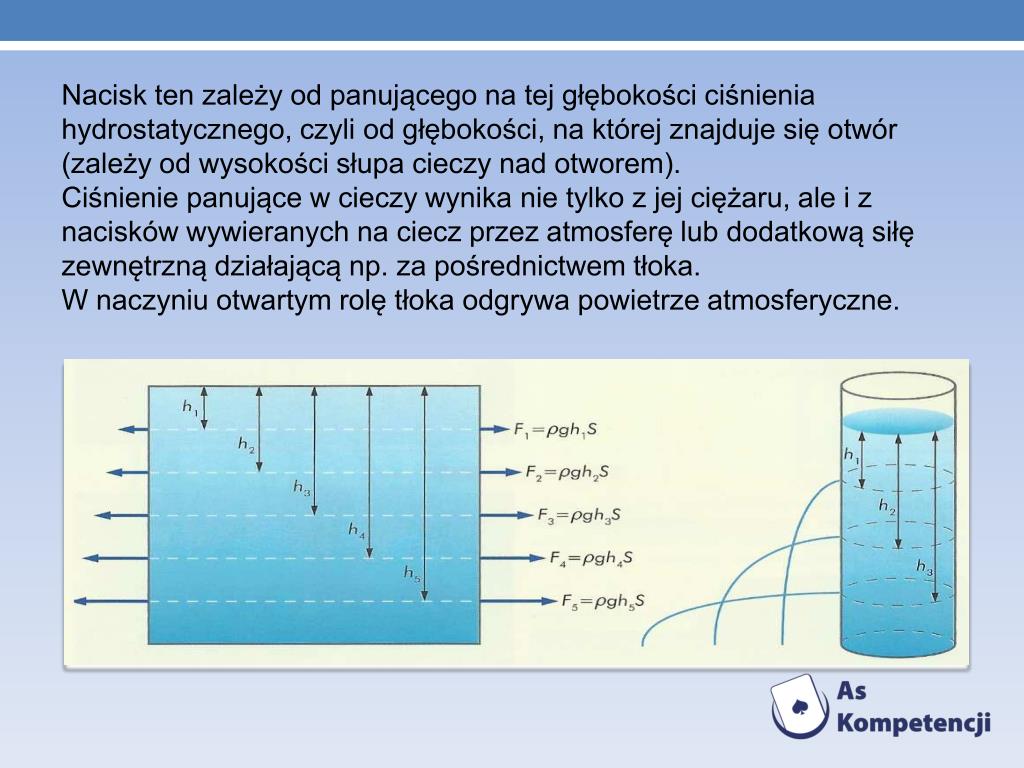 Nacisk ten zależy od panującego na tej głębokości ciśnienia hydrostatycznego, czyli od głębokości, na której znajduje się otwór (zależy od wysokości słupa cieczy nad otworem). • Ciśnienie panujące w cieczy wynika nie tylko z jej ciężaru, ale i z nacisków wywieranych na ciecz przez atmosferę lub dodatkową siłę zewnętrzną działającą np. za pośrednictwem tłoka. • W naczyniu otwartym rolę tłoka odgrywa powietrze atmosferyczne.