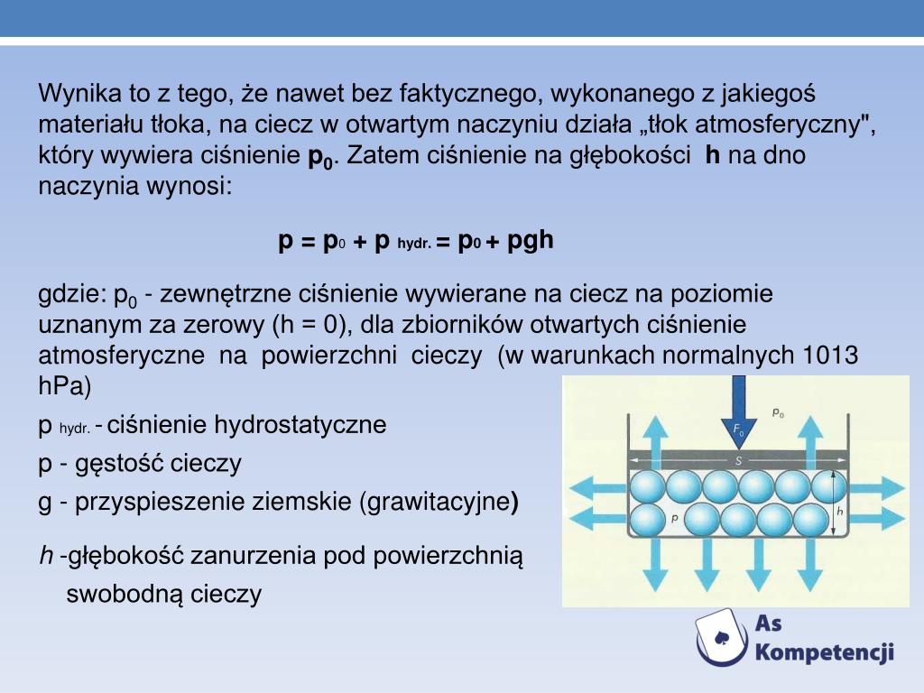 Wynika to z tego, że nawet bez faktycznego, wykonanego z jakiegoś materiału tłoka, na ciecz w otwartym naczyniu działa „tłok atmosferyczny", który wywiera ciśnienie p0. Zatem ciśnienie na głębokości h na dno naczynia wynosi: • p = p0 + p hydr. = p0 + pgh • gdzie: p0 - zewnętrzne ciśnienie wywierane na ciecz na poziomie uznanym za zerowy (h = 0), dla zbiorników otwartych ciśnienie atmosferyczne na powierzchni cieczy (w warunkach normalnych 1013 hPa) • p hydr. -ciśnienie hydrostatyczne • p - gęstość cieczy • g - przyspieszenie ziemskie (grawitacyjne) • h -głębokość zanurzenia pod powierzchnią • swobodną cieczy