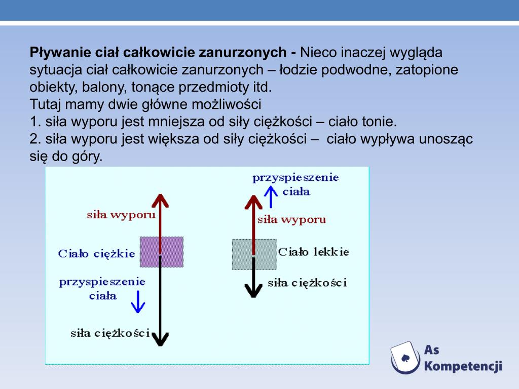 Pływanie ciał całkowicie zanurzonych - Nieco inaczej wygląda sytuacja ciał całkowicie zanurzonych – łodzie podwodne, zatopione obiekty, balony, tonące przedmioty itd. • Tutaj mamy dwie główne możliwości • 1. siła wyporu jest mniejsza od siły ciężkości – ciało tonie. • 2. siła wyporu jest większa od siły ciężkości – ciało wypływa unosząc się do góry.