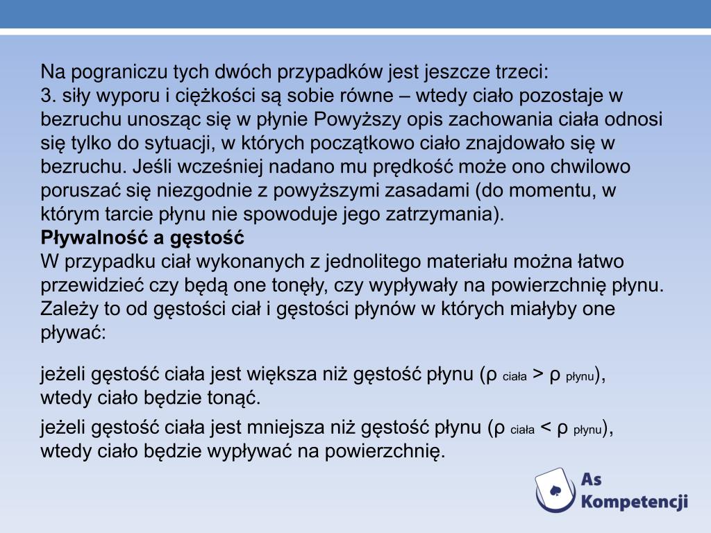 Na pograniczu tych dwóch przypadków jest jeszcze trzeci: • 3. siły wyporu i ciężkości są sobie równe – wtedy ciało pozostaje w bezruchu unosząc się w płynie Powyższy opis zachowania ciała odnosi się tylko do sytuacji, w których początkowo ciało znajdowało się w bezruchu. Jeśli wcześniej nadano mu prędkość może ono chwilowo poruszać się niezgodnie z powyższymi zasadami (do momentu, w którym tarcie płynu nie spowoduje jego zatrzymania). • Pływalność a gęstość • W przypadku ciał wykonanych z jednolitego materiału można łatwo przewidzieć czy będą one tonęły, czy wypływały na powierzchnię płynu. Zależy to od gęstości ciał i gęstości płynów w których miałyby one pływać: • jeżeli gęstość ciała jest większa niż gęstość płynu (ρ ciała > ρ płynu), • wtedy ciało będzie tonąć. • jeżeli gęstość ciała jest mniejsza niż gęstość płynu (ρ ciała < ρ płynu), wtedy ciało będzie wypływać na powierzchnię.