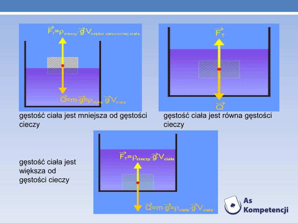 gęstość ciała jest mniejsza od gęstości cieczy gęstość ciała jest równa gęstości cieczy gęstość ciała jest większa od gęstości cieczy
