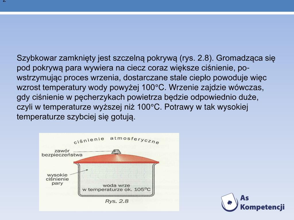 Z • Szybkowar zamknięty jest szczelną pokrywą (rys. 2.8). Gromadząca się pod pokrywą para wywiera na ciecz coraz większe ciśnienie, powstrzymując proces wrzenia, dostarczane stale ciepło powoduje więc wzrost temperatury wody powyżej 100°C. Wrzenie zajdzie wówczas, gdy ciśnienie w pęcherzykach powietrza będzie odpowiednio duże, czyli w temperaturze wyższej niż 100°C. Potrawy w tak wysokiej temperaturze szybciej się gotują.