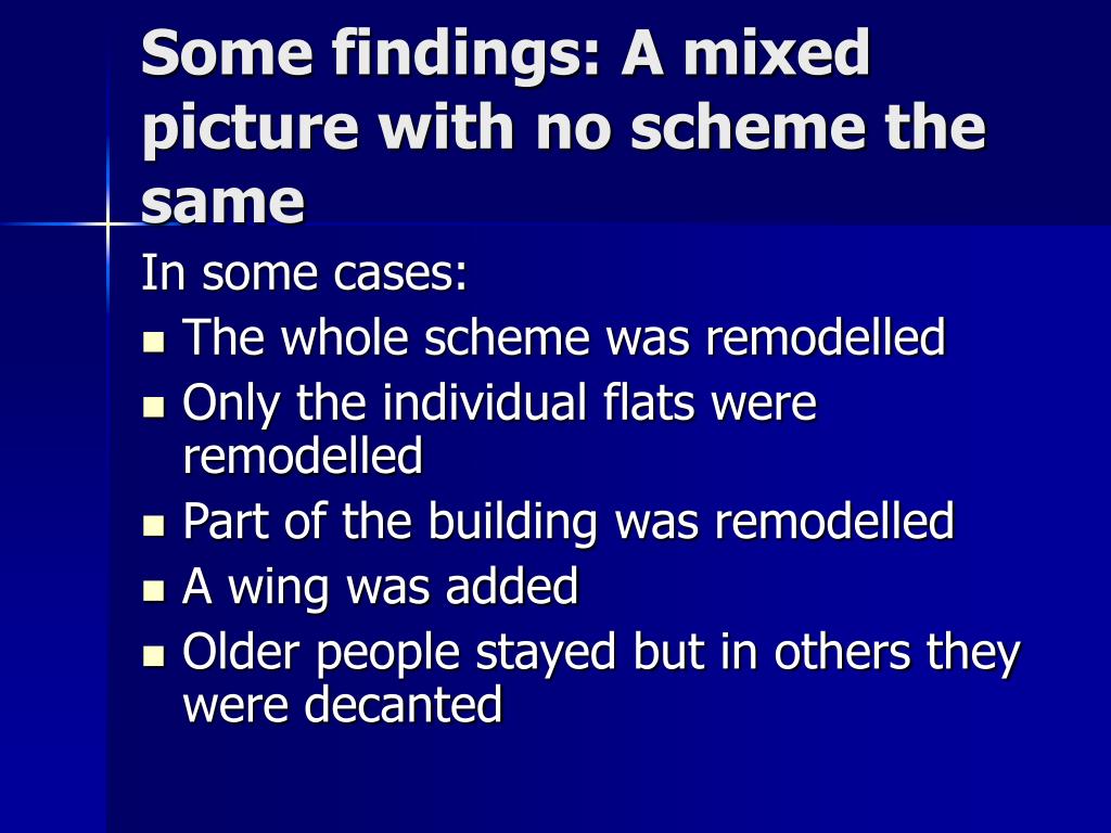 Some findings: A mixed picture with no scheme the same In some cases: • The whole scheme was remodelled • Only the individual flats were remodelled • Part of the building was remodelled • A wing was added • Older people stayed but in others they were decanted