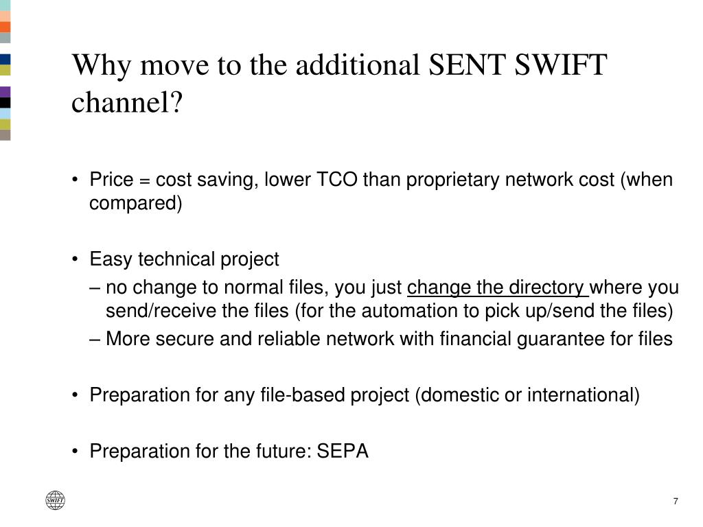 Why move to the additional SENT SWIFT channel? • Price = costsaving, lower TCO thanproprietary network cost (whencompared) • Easytechnicalproject • no change to normal files, youjustchange the directory whereyousend/receive the files (for the automation to pick up/send the files) • More secure and reliable network withfinancialguarantee for files • Preparation for any file-basedproject (domestic or international) • Preparation for the future: SEPA