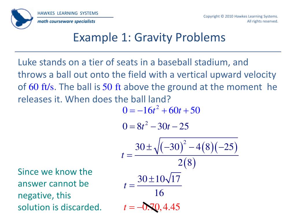 Example 1: Gravity Problems Luke stands on a tier of seats in a baseball stadium, and throws a ball out onto the field with a vertical upward velocity of . The ball is above the ground at the moment he releases it. When does the ball land? Since we know the answer cannot be negative, this solution is discarded.