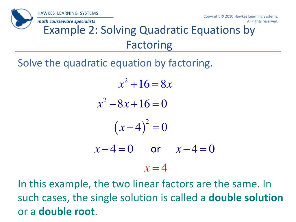 Example 2: Solving Quadratic Equations by Factoring Solve the quadratic equation by factoring. or In this example, the two linear factors are the same. In such cases, the single solution is called a double solution or a double root.