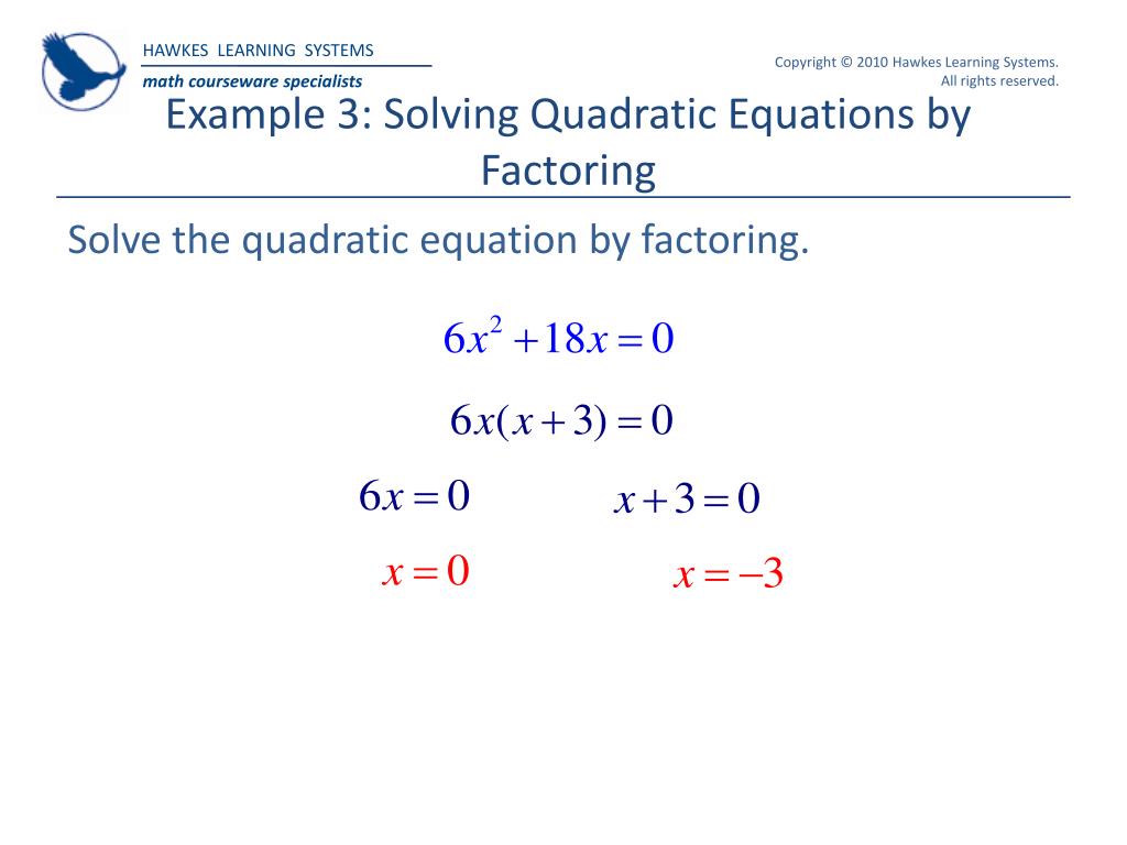 Example 3: Solving Quadratic Equations by Factoring Solve the quadratic equation by factoring.