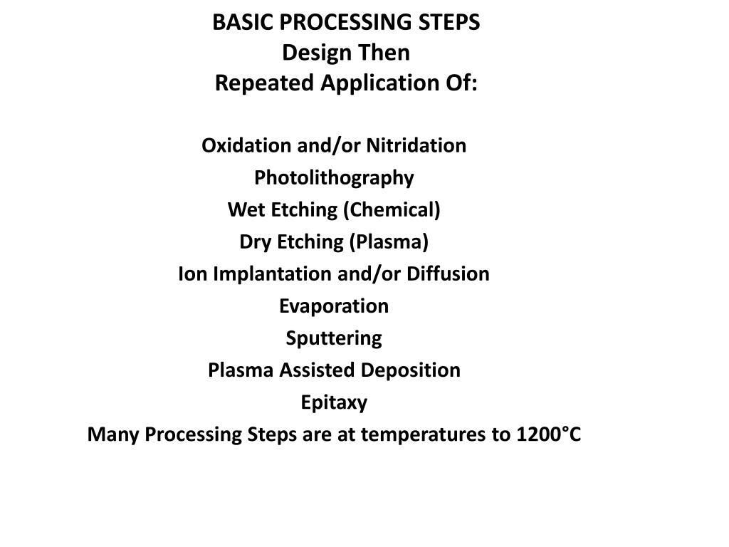 BASIC PROCESSING STEPSDesign ThenRepeated Application Of: Oxidation and/orNitridation Photolithography Wet Etching (Chemical) Dry Etching (Plasma) Ion Implantation and/or Diffusion Evaporation Sputtering Plasma Assisted Deposition Epitaxy Many Processing Steps are at temperatures to 1200°C