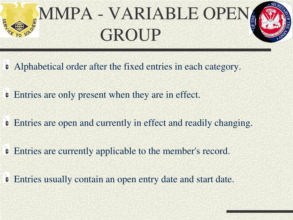 MMPA - VARIABLE OPEN GROUP • Alphabetical order after the fixed entries in each category. • Entries are only present when they are in effect. • Entries are open and currently in effect and readily changing. • Entries are currently applicable to the member's record. • Entries usually contain an open entry date and start date.