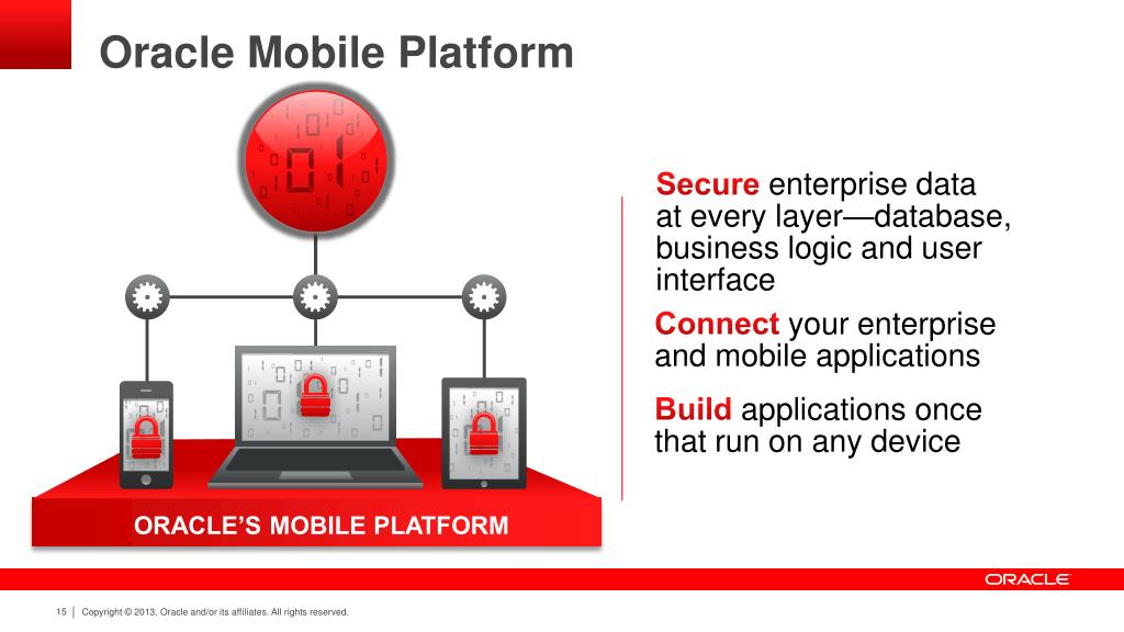 Oracle Mobile Platform Secure enterprise data at every layer—database, business logic and user interface Connect your enterprise and mobile applications Build applications oncethat run on any device ORACLE’S MOBILE PLATFORM