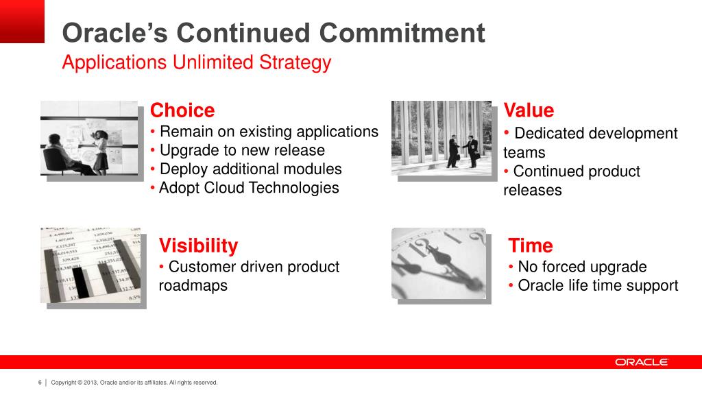 Oracle’s Continued Commitment Applications Unlimited Strategy • Choice • Remain on existing applications • Upgrade to new release • Deploy additional modules • Adopt Cloud Technologies • Value • Dedicated development teams • Continued product releases • Visibility • Customer driven product roadmaps • Time • No forced upgrade • Oracle life time support