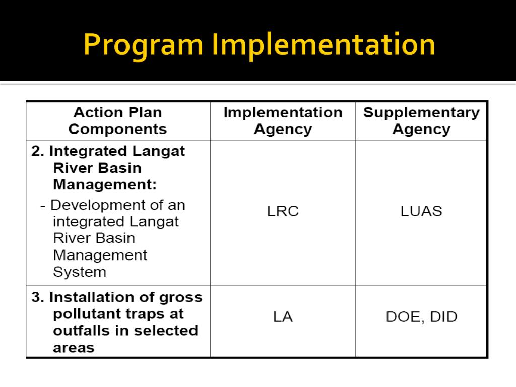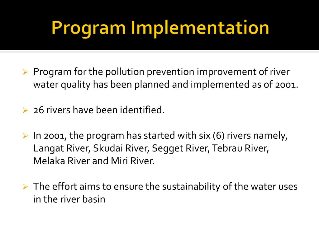 Program Implementation • Program for the pollution prevention improvement of river water quality has been planned and implemented as of 2001. • 26 rivers have been identified. • In 2001, the program has started with six (6) rivers namely, Langat River, Skudai River, Segget River, Tebrau River, Melaka River and Miri River. • The effort aims to ensure the sustainability of the water uses in the river basin