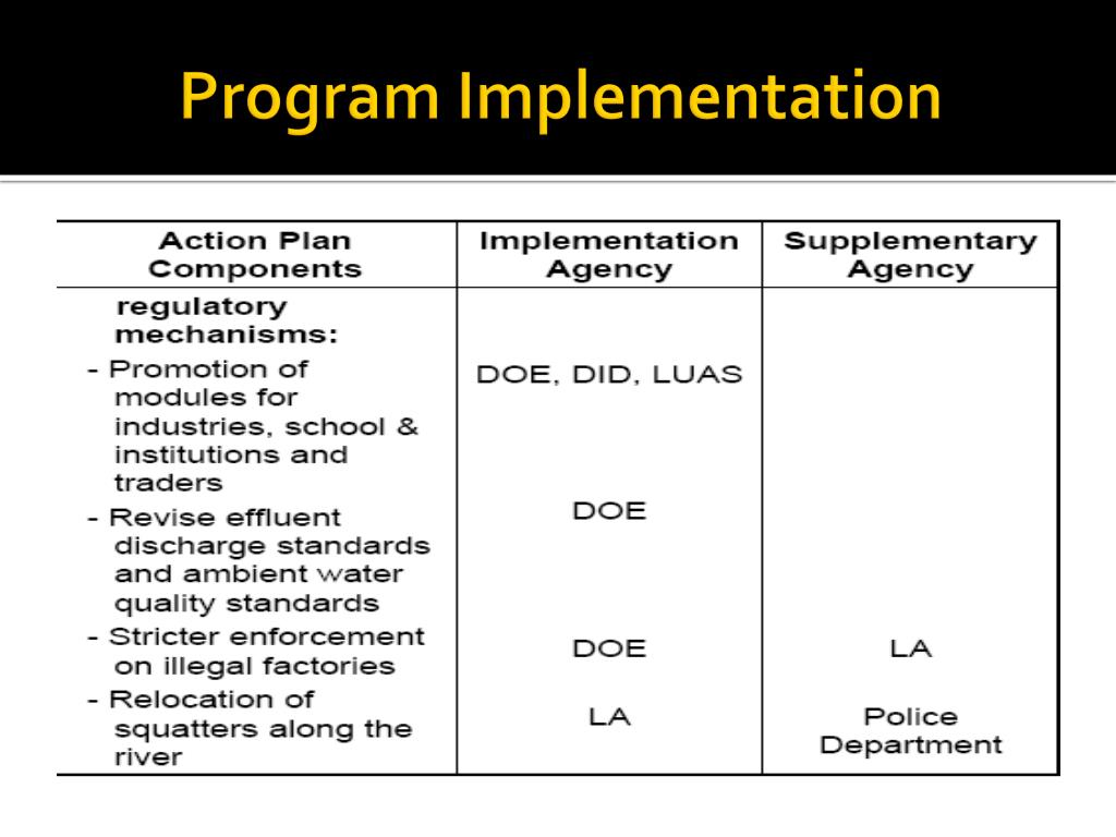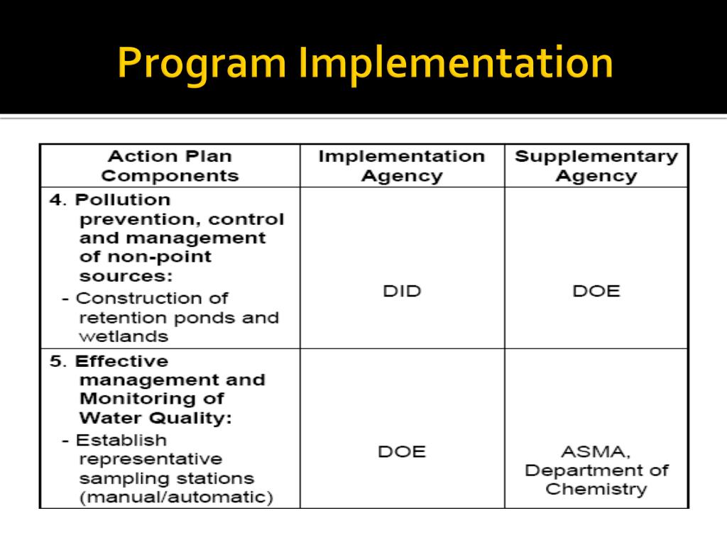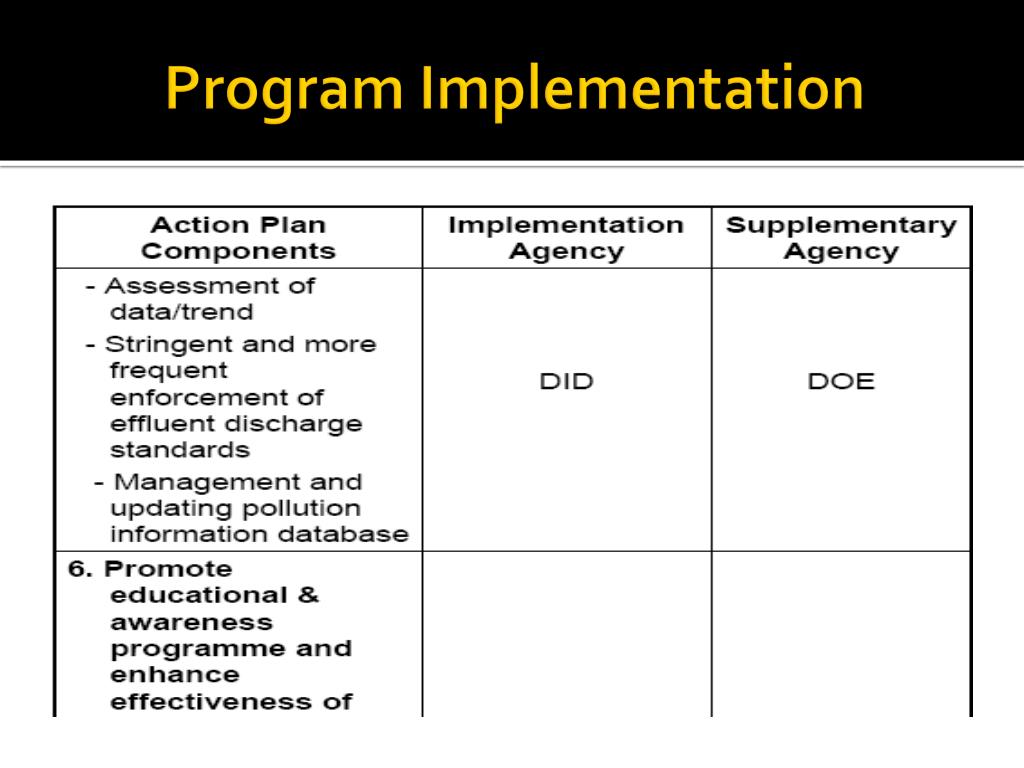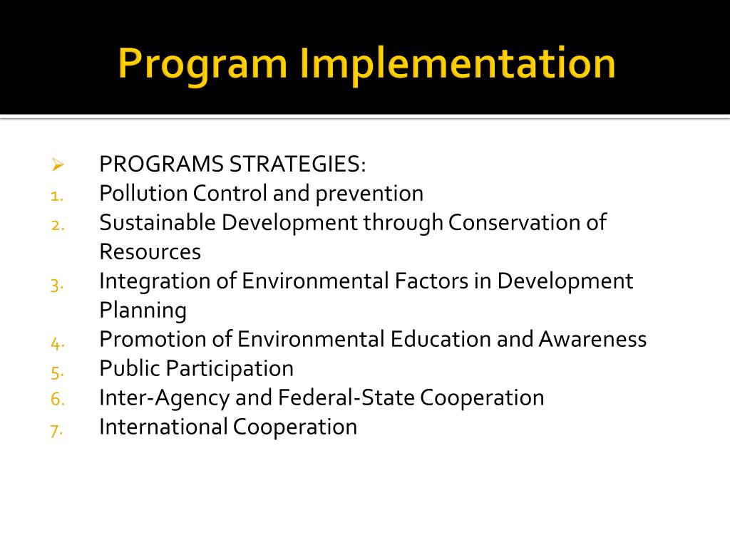 Program Implementation • PROGRAMS STRATEGIES: • Pollution Control and prevention • Sustainable Development through Conservation of Resources • Integration of Environmental Factors in Development Planning • Promotion of Environmental Education and Awareness • Public Participation • Inter-Agency and Federal-State Cooperation • International Cooperation