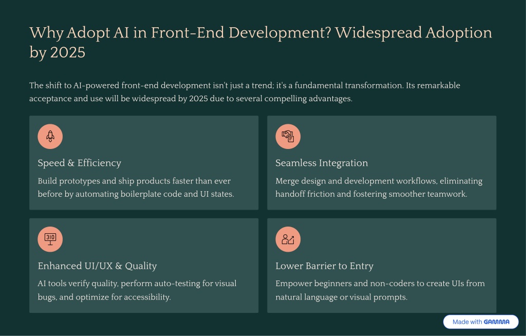 Why Adopt AI in Front-End Development? Widespread Adoption by 2025 The shift to AI-powered front-end development isn't just a trend; it's a fundamental transformation. Its remarkable acceptance and use will be widespread by 2025 due to several compelling advantages. Speed & Efficiency Seamless Integration Build prototypes and ship products faster than ever before by automating boilerplate code and UI states. Merge design and development workflows, eliminating handoff friction and fostering smoother teamwork. Enhanced UI/UX & Quality Lower Barrier to Entry AI tools verify quality, perform auto-testing for visual Empower beginners and non-coders to create UIs from bugs, and optimize for accessibility. natural language or visual prompts.
