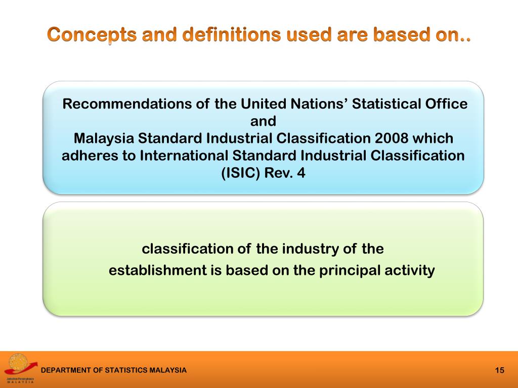 Concepts and definitions used are based on.. Recommendations of the United Nations’ Statistical Office and Malaysia Standard Industrial Classification 2008 which adheres to International Standard Industrial Classification (ISIC) Rev. 4 classification of the industry of the establishment is based on the principal activity