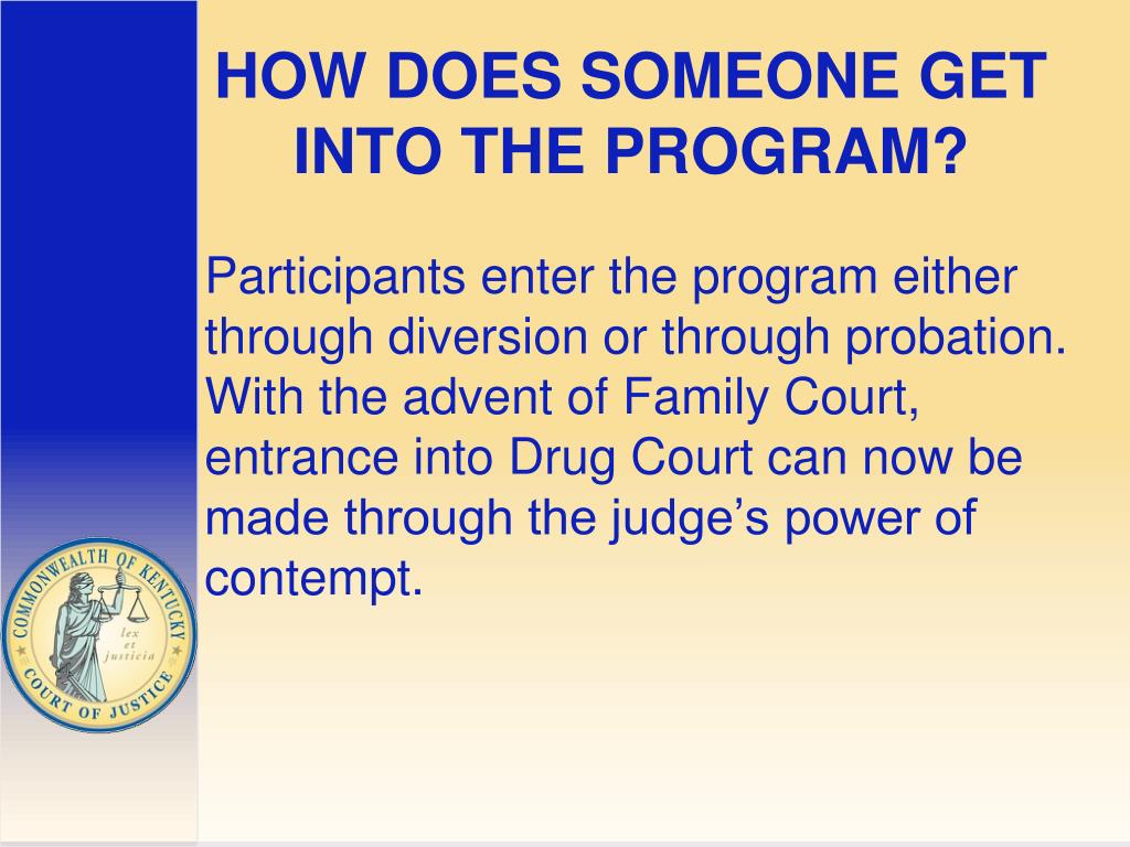 HOW DOES SOMEONE GET INTO THE PROGRAM? Participants enter the program either through diversion or through probation. With the advent of Family Court, entrance into Drug Court can now be made through the judge’s power of contempt.