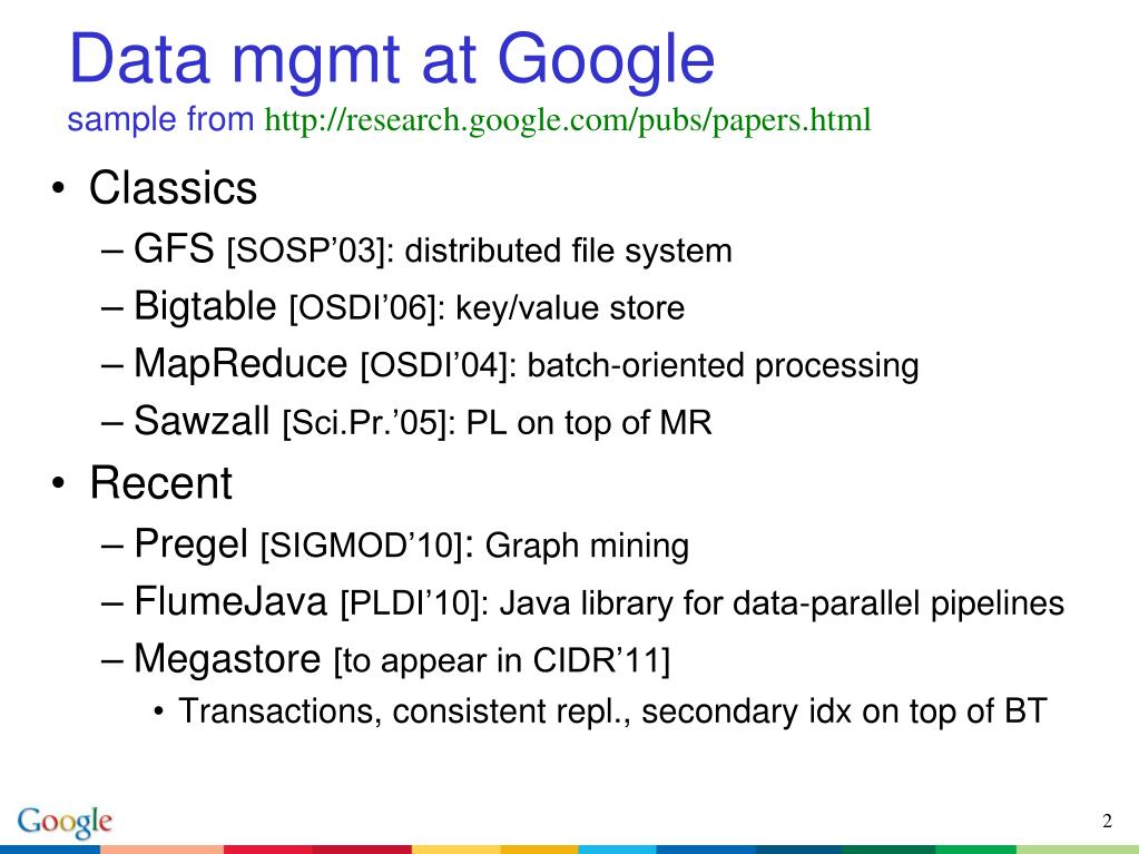 Data mgmt at Googlesample from http://research.google.com/pubs/papers.html • Classics • GFS [SOSP’03]: distributed file system • Bigtable[OSDI’06]: key/value store • MapReduce[OSDI’04]: batch-oriented processing • Sawzall[Sci.Pr.’05]: PL on top of MR • Recent • Pregel[SIGMOD’10]: Graph mining • FlumeJava[PLDI’10]: Java library for data-parallel pipelines • Megastore [to appear in CIDR’11] • Transactions, consistent repl., secondary idx on top of BT