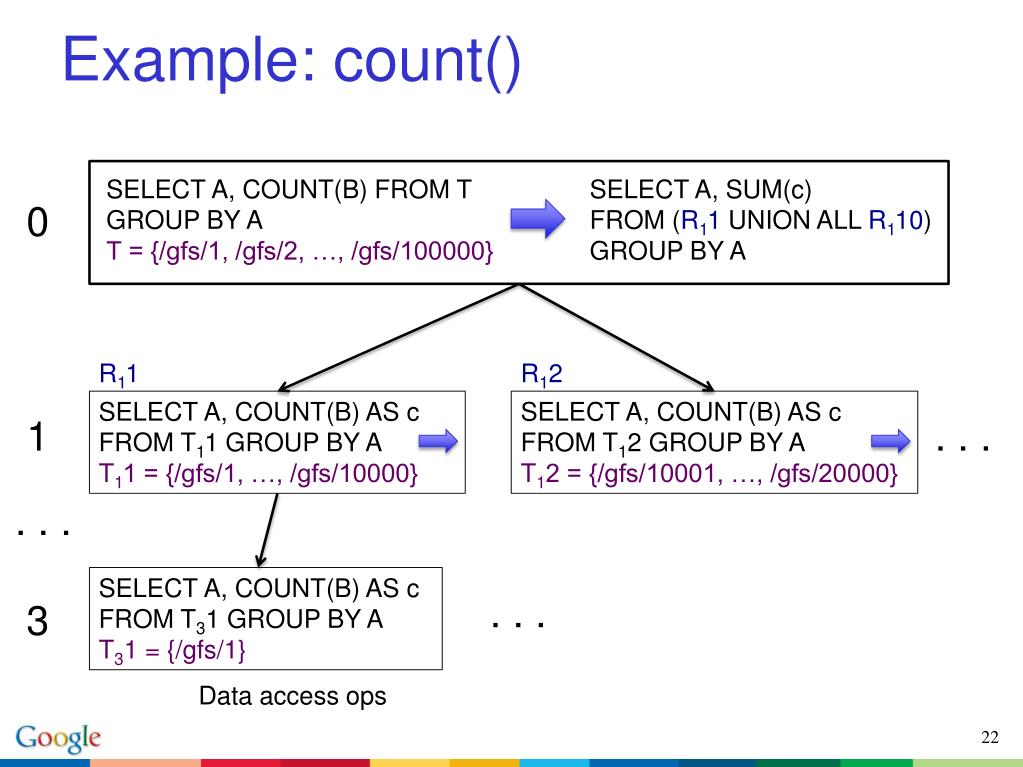 Example: count() SELECT A, COUNT(B) FROM T GROUP BY A T = {/gfs/1, /gfs/2, …, /gfs/100000} SELECT A, SUM(c)FROM (R11 UNION ALL R110)GROUP BY A 0 R11 R12 SELECT A, COUNT(B) AS cFROM T11 GROUP BY A T11 = {/gfs/1, …, /gfs/10000} SELECT A, COUNT(B) AS cFROM T12 GROUP BY A T12 = {/gfs/10001, …, /gfs/20000} 1 . . . . . . SELECT A, COUNT(B) AS cFROM T31 GROUP BY A T31 = {/gfs/1} . . . 3 Data access ops