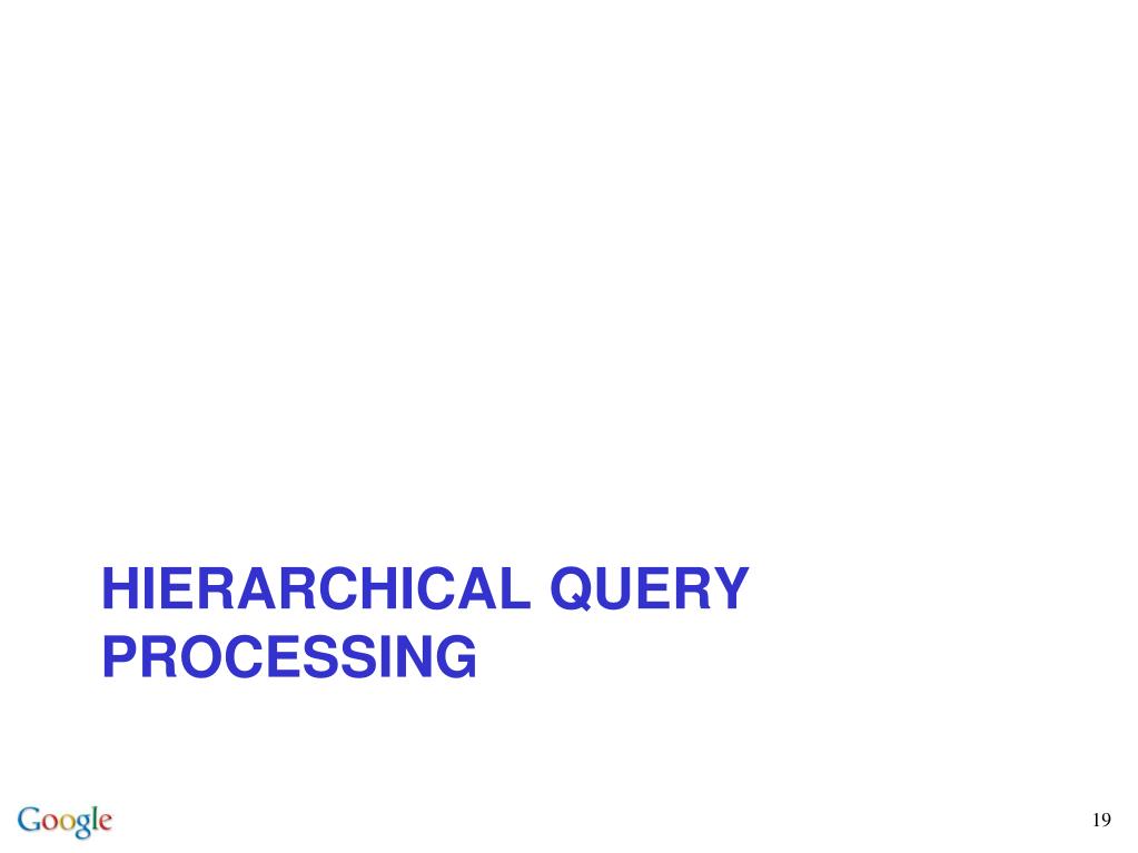 Impact of serving tree depth The deeper the tree,the better we canparallelize aggregation execution time (sec) (returns 100s of records) (returns 1M records) SELECT country, SUM(item.amount) FROM T2GROUP BY country Q2: SELECT domain, SUM(item.amount) FROM T2WHERE domain CONTAINS ’.net’GROUP BY domain Q3: 40 billion nested items