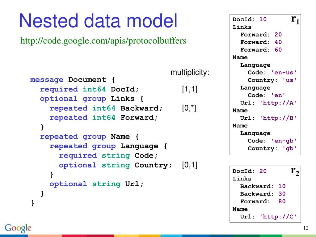 Nested data model r1 DocId: 10 Links Forward: 20 Forward: 40 Forward: 60 Name Language Code: 'en-us' Country: 'us' Language Code: 'en' Url: 'http://A' Name Url: 'http://B' Name Language Code: 'en-gb' Country: 'gb' http://code.google.com/apis/protocolbuffers multiplicity: message Document { required int64 DocId; [1,1] optional group Links { repeated int64 Backward; [0,*] repeated int64 Forward; } repeated group Name { repeated group Language { required string Code; optional string Country; [0,1] } optional string Url; }} r2 DocId: 20 Links Backward: 10 Backward: 30 Forward: 80 Name Url: 'http://C'