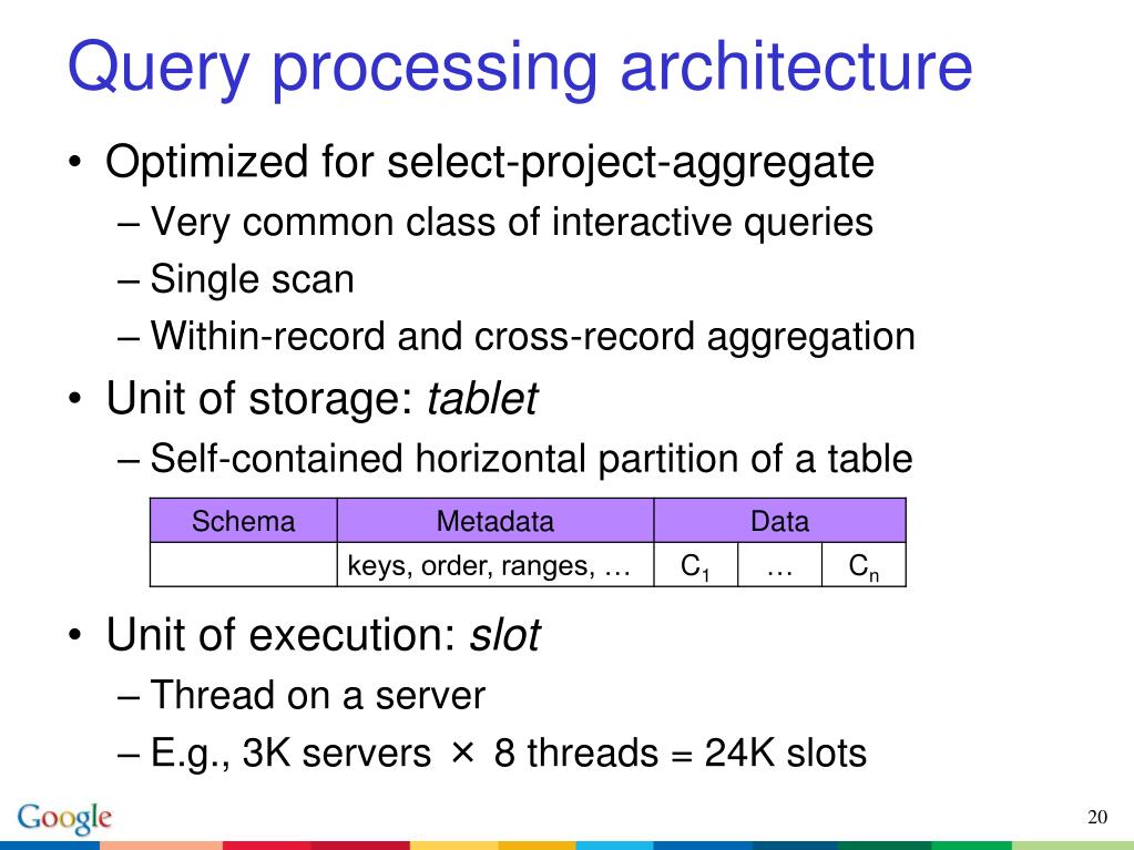 Query processing architecture • Optimized for select-project-aggregate • Very common class of interactive queries • Single scan • Within-record and cross-record aggregation • Unit of storage: tablet • Self-contained horizontal partition of a table • Unit of execution: slot • Thread on a server • E.g., 3K servers × 8 threads = 24K slots