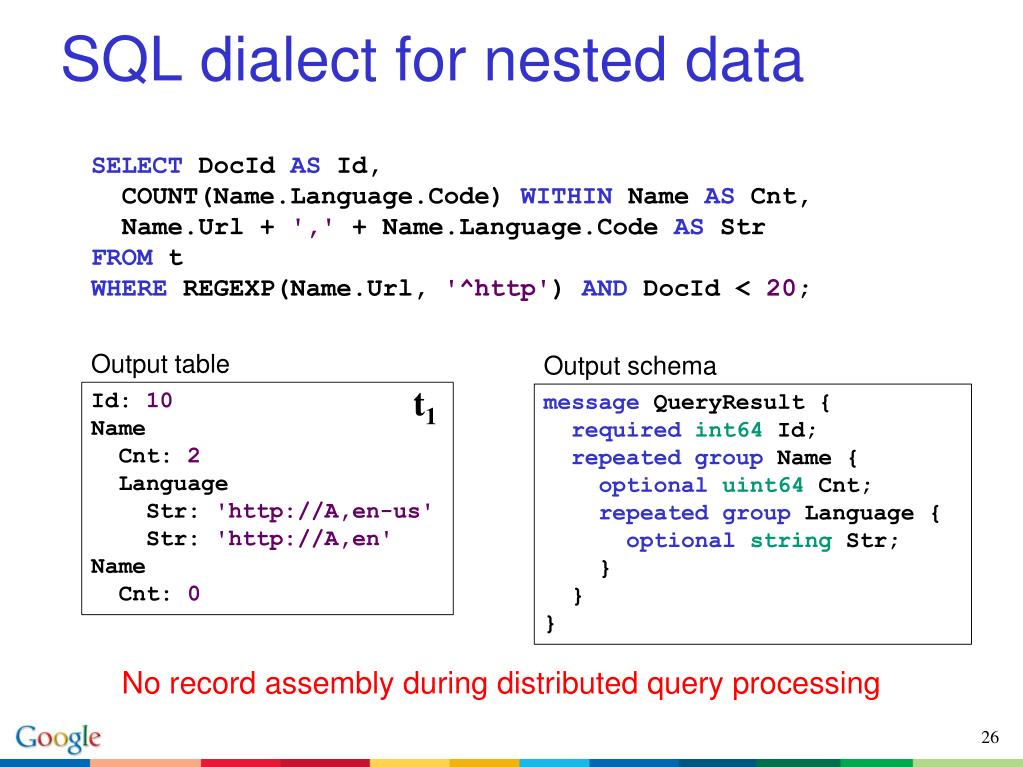 SQL dialect for nested data SELECTDocIdAS Id, COUNT(Name.Language.Code) WITHIN Name ASCnt,Name.Url + ',' + Name.Language.CodeASStrFROMtWHEREREGEXP(Name.Url, '^http') ANDDocId < 20; Output table Output schema t1 Id: 10 Name Cnt: 2 Language Str: 'http://A,en-us' Str: 'http://A,en' Name Cnt: 0 message QueryResult { required int64 Id; repeated group Name { optional uint64 Cnt; repeated group Language { optional string Str; } }} No record assembly during distributed query processing