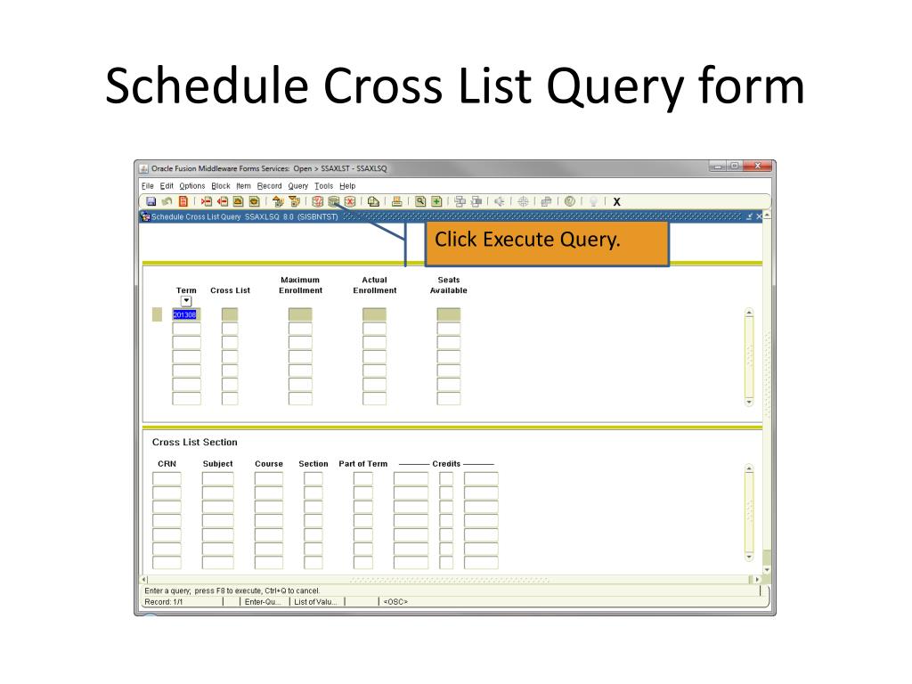 SCHEDULE. Cross Listing Courses. Click on the Notes tab for captions!. Type in SSAXLST in the Go To… box. Hit Enter. Schedule Cross List Definition form. 1. Type in or select Term. 2. Click Cross List Group Identifier drop down arrow. Schedule Cross List Query form. Click Execute Query.