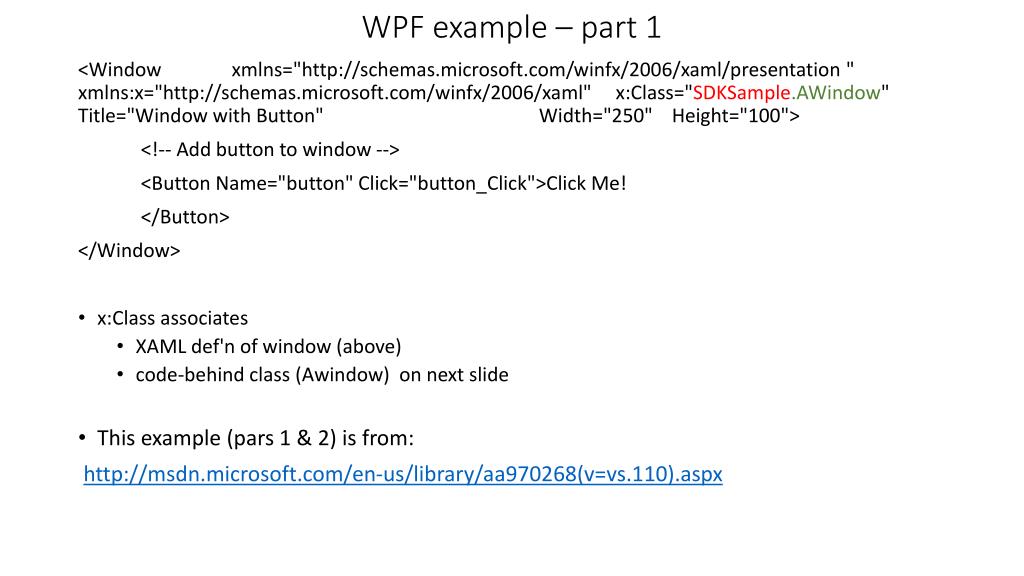 WPF example – part 1 <Window xmlns="http://schemas.microsoft.com/winfx/2006/xaml/presentation " xmlns:x="http://schemas.microsoft.com/winfx/2006/xaml" x:Class="SDKSample.AWindow" Title="Window with Button" Width="250" Height="100"> <!-- Add button to window --> <Button Name="button" Click="button_Click">Click Me! </Button> </Window> • x:Class associates • XAML def'n of window (above) • code-behind class (Awindow) on next slide • This example (pars 1 & 2) is from: http://msdn.microsoft.com/en-us/library/aa970268(v=vs.110).aspx