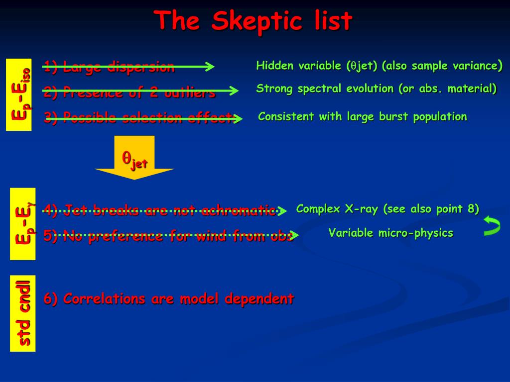 The Skeptic list Hidden variable (jet) (also sample variance) 1) Large dispersion 2) Presence of 2 outliers 3) Possible selection effects Strong spectral evolution (or abs. material) Ep-Eiso Consistent with large burst population jet 4) Jet breaks are not achromatic 5) No preference for wind from obs Complex X-ray (see also point 8) Ep-Eg Variable micro-physics 6) Correlations are model dependent std cndl