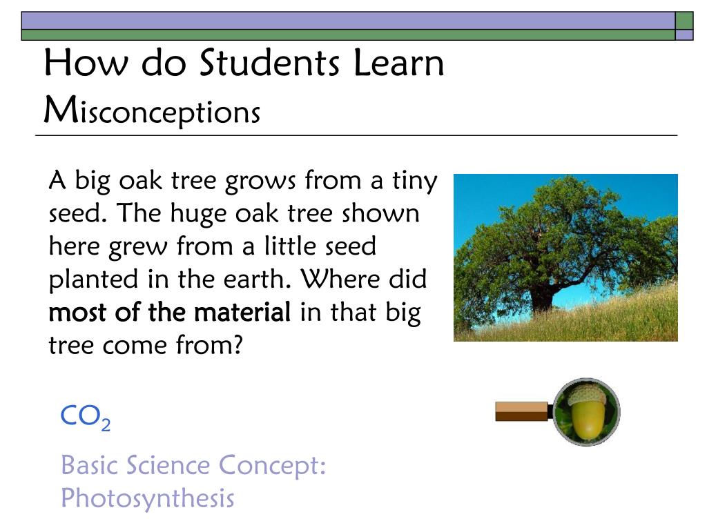 How do Students LearnMisconceptions A big oak tree grows from a tiny seed. The huge oak tree shown here grew from a little seed planted in the earth. Where did most of the material in that big tree come from? CO2 Basic Science Concept: Photosynthesis