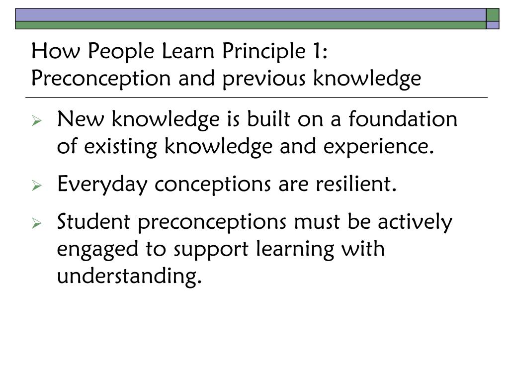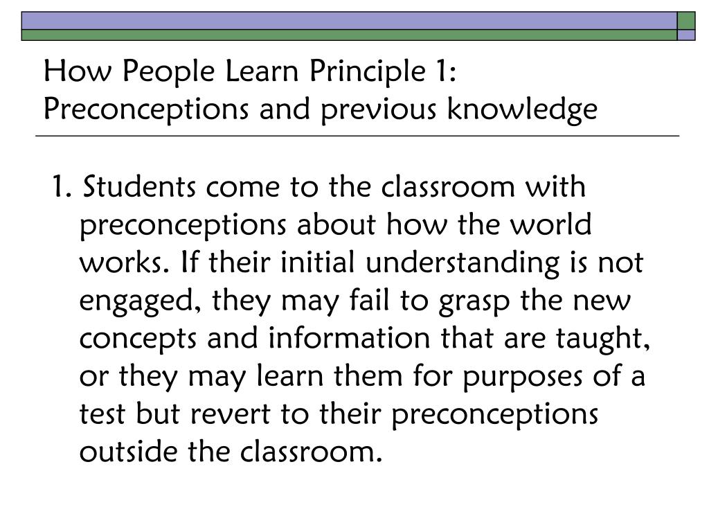How People Learn Principle 1:Preconceptions and previous knowledge 1. Students come to the classroom with preconceptions about how the world works. If their initial understanding is not engaged, they may fail to grasp the new concepts and information that are taught, or they may learn them for purposes of a test but revert to their preconceptions outside the classroom.
