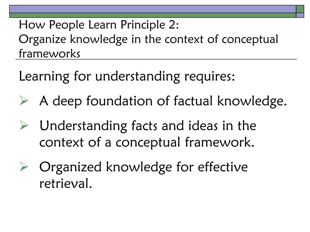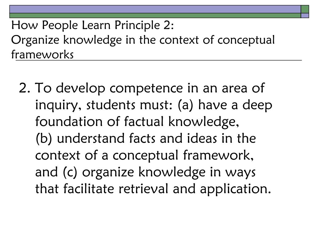 How People Learn Principle 2:Organize knowledge in the context of conceptual frameworks 2. To develop competence in an area of inquiry, students must: (a) have a deep foundation of factual knowledge, (b) understand facts and ideas in the context of a conceptual framework, and (c) organize knowledge in ways that facilitate retrieval and application.
