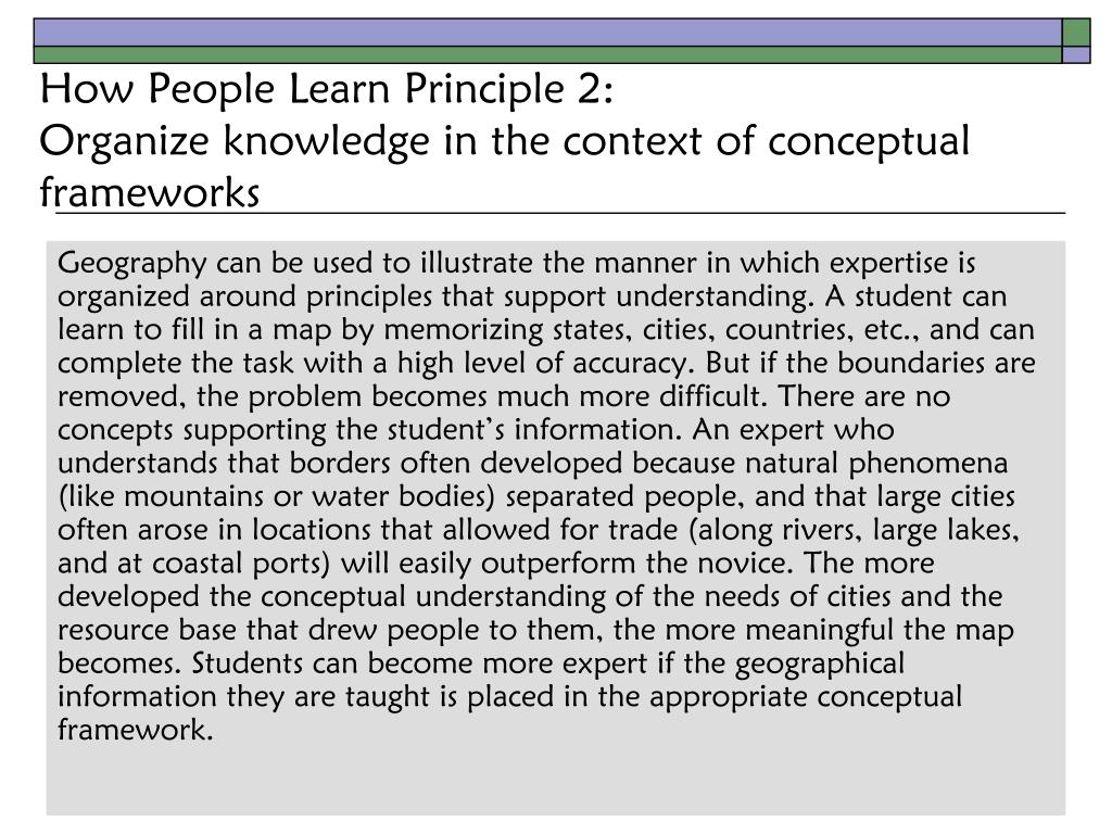 How People Learn Principle 2:Organize knowledge in the context of conceptual frameworks Geography can be used to illustrate the manner in which expertise is organized around principles that support understanding. A student can learn to fill in a map by memorizing states, cities, countries, etc., and can complete the task with a high level of accuracy. But if the boundaries are removed, the problem becomes much more difficult. There are no concepts supporting the student’s information. An expert who understands that borders often developed because natural phenomena (like mountains or water bodies) separated people, and that large cities often arose in locations that allowed for trade (along rivers, large lakes, and at coastal ports) will easily outperform the novice. The more developed the conceptual understanding of the needs of cities and the resource base that drew people to them, the more meaningful the map becomes. Students can become more expert if the geographical information they are taught is placed in the appropriate conceptual framework.