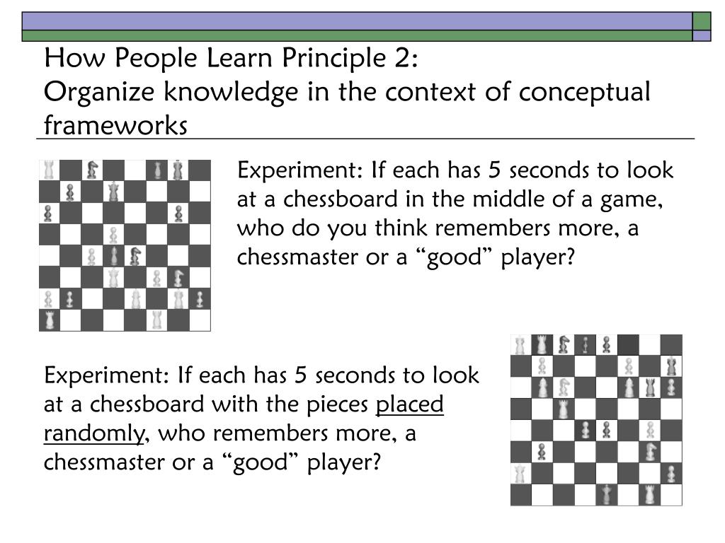 How People Learn Principle 2:Organize knowledge in the context of conceptual frameworks Experiment: If each has 5 seconds to look at a chessboard in the middle of a game, who do you think remembers more, a chessmaster or a “good” player? Experiment: If each has 5 seconds to look at a chessboard with the pieces placed randomly, who remembers more, a chessmaster or a “good” player?
