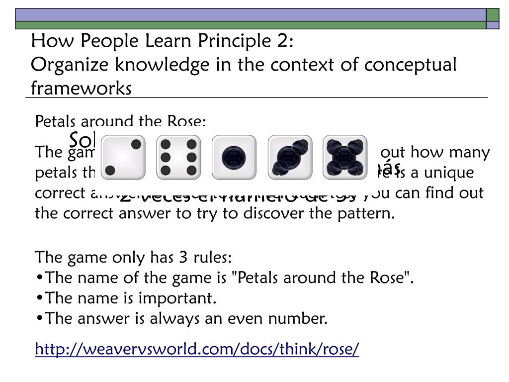 How People Learn Principle 2:Organize knowledge in the context of conceptual frameworks Petals around the Rose: The game consists of throwing 5 dice to figure out how many petals there are around the rose given that there is a unique correct answer for each toss. After each toss you can find out the correct answer to try to discover the pattern. Solución aislada: 4 veces el número de 5s más 2 veces el número de 3s • The game only has 3 rules: • The name of the game is "Petals around the Rose". • The name is important. • The answer is always an even number. • http://weavervsworld.com/docs/think/rose/