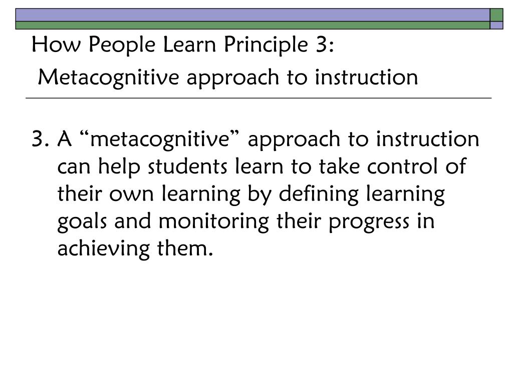 How People Learn Principle 3: Metacognitive approach to instruction 3. A “metacognitive” approach to instruction can help students learn to take control of their own learning by defining learning goals and monitoring their progress in achieving them.