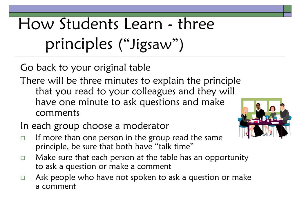 How Students Learn - three principles (“Jigsaw”) Go back to your original table There will be three minutes to explain the principle that you read to your colleagues and they will have one minute to ask questions and make comments In each group choose a moderator • If more than one person in the group read the same principle, be sure that both have “talk time” • Make sure that each person at the table has an opportunity to ask a question or make a comment • Ask people who have not spoken to ask a question or make a comment
