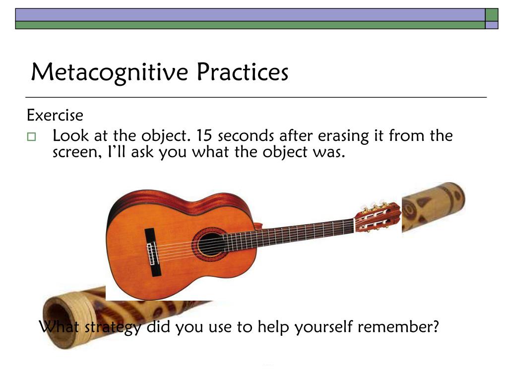 Exercise Look at the object. 15 seconds after erasing it from the screen, I’ll ask you what the object was. Metacognitive Practices What strategy did you use to help yourself remember?